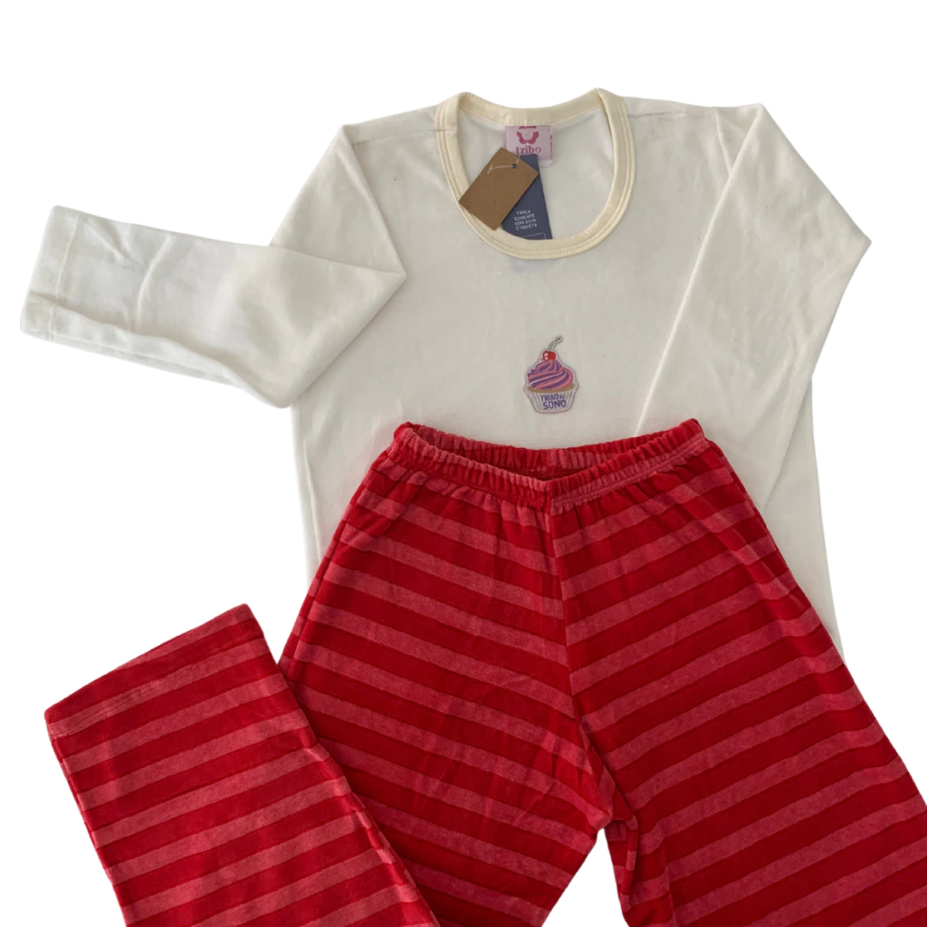 Pijama quentinho em plush, com aplicação do desenho de um cup cake, com blusa de mangas cumpridas na cor marfim e calças na cor vermelha e listras brancas. Ideal para deixar as noites de sono confortáveis e quentinhas.